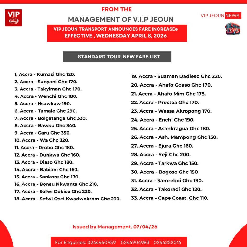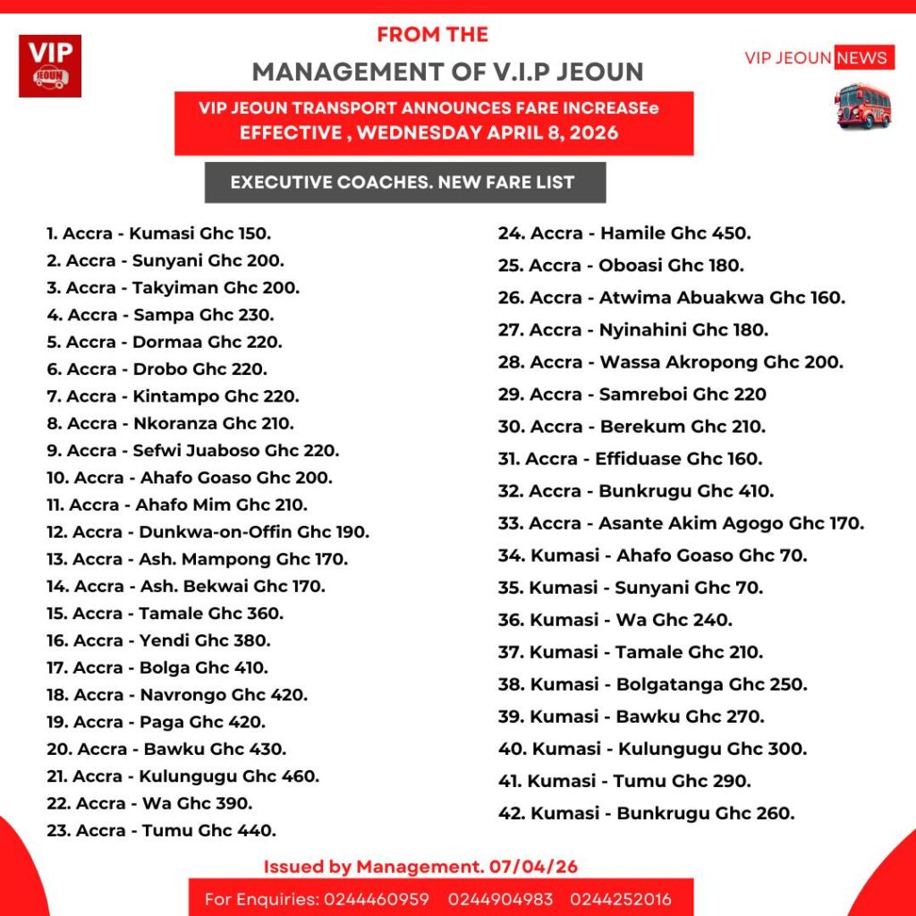 VIP Jeoun Transport has announced a significant upward adjustment in fares for its executive coach and standard tour services, effective Wednesday, April 8, 2026.