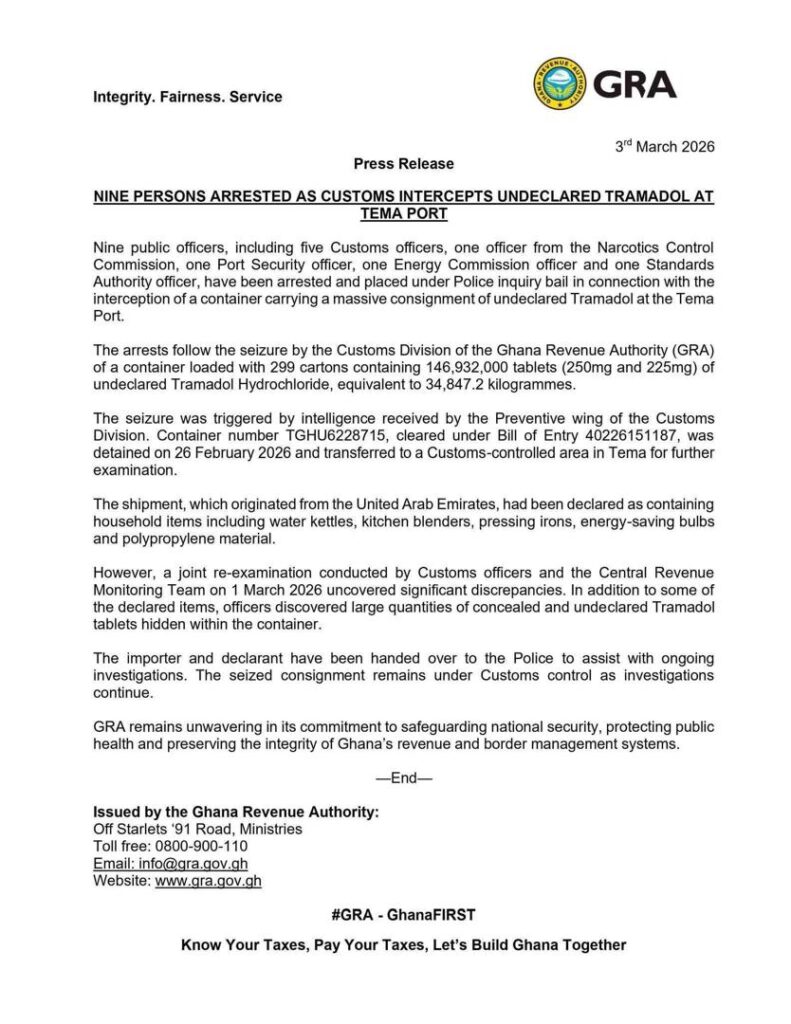 The GRA has reaffirmed its unwavering commitment to protecting national security, safeguarding public health, and preserving the integrity of Ghana’s revenue and border management systems.